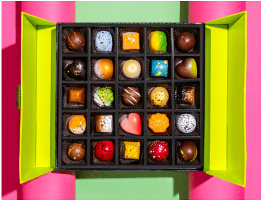The Chocolate Season goes above your standard gift box. You can customize a gift box full of delicious sweets and savory snacks. They’ll even let you customize a chocolate box in your preferred color (hello, branding!)