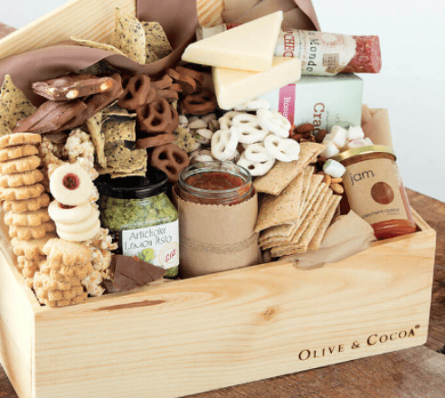 Olive & Cocoa crafts beautiful sets in hand crafted wooden crates or reusable canvas and burlap tote bags. The snack sets have a range of tasty treats from salsa and pesto, to cookies and chocolate covered pretzels. YUM!
