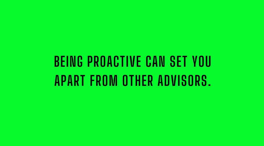 Being proactive can set you apart from other advisors and help you build stronger relationships with your clients. Anticipating their needs, providing personalized recommendations, and reaching out before they need to contact you can all help you stay top of mind and increase their trust in you.